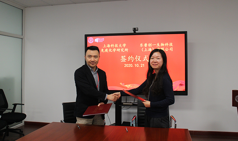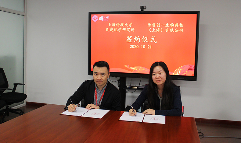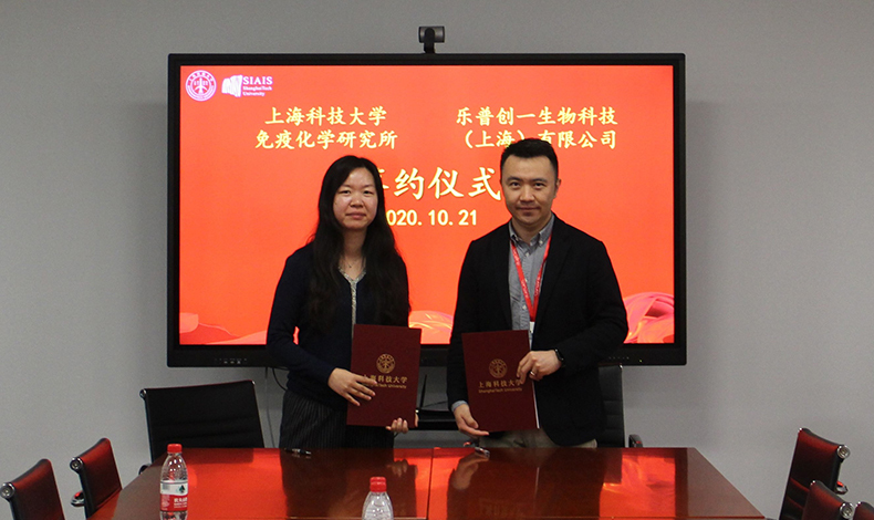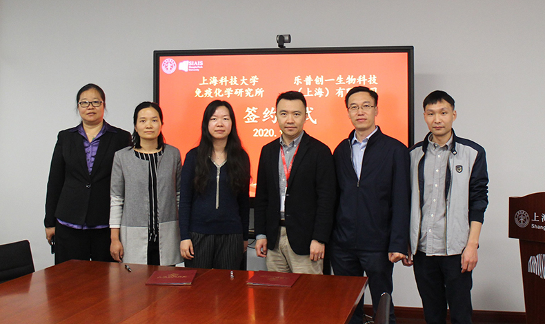 2020年10月21日,上??萍即髮W(xué)免疫化學(xué)研究所與樂(lè )普創(chuàng )一生物科技(上海)有限公司舉行科研合作簽約儀式。上??萍即髮W(xué)免疫化學(xué)研究所助理所長(cháng)、高通量篩選平臺主任雷穎,上??萍即髮W(xué)免疫化學(xué)研究所高通量篩選平臺工程師孔娟,上??萍即髮W(xué)免疫化學(xué)研究所高通量篩選平臺工程師姜連連,樂(lè )普創(chuàng )一生物科技(上海)有限公司總經(jīng)理方磊,樂(lè )普創(chuàng )一生物科技(上海)有限公司抗體平臺主任曲志虎,樂(lè )普創(chuàng )一生物科技(上海)有限公司科學(xué)家王旭輝等出席簽約儀式。