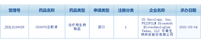 樂(lè )普生物科技股份有限公司(以下簡(jiǎn)稱(chēng)“樂(lè )普生物”)“CG0070注射液”臨床試驗申請已獲國家藥監局藥品審評中心(CDE)受理(受理號:JXSL2100029),并于2021年3月4日公示。